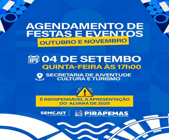 A Prefeitura de Pirapemas, por meio da Secretaria Municipal de Juventude, Cultura e Turismo, informa que o agendamento de festas e eventos para os meses de outubro e novembro será realizado no dia: