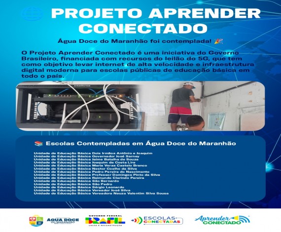 Nosso município foi contemplado pelo Projeto Aprender Conectado, uma iniciativa do Governo Federal que leva internet de alta velocidade, Wi-Fi e infraestrutura digital para escolas públicas, promovendo mais inclusão, tecnologia e oportunidades para nossos estudantes.