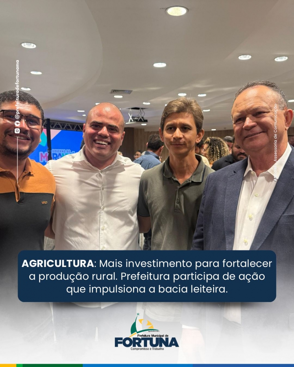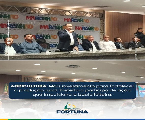 A Prefeitura de Fortuna, por meio da Secretaria Municipal de Agricultura e Abastecimento, participou da solenidade de entrega de tanques resfriadores de leite realizada pelo Governo do Maranhão, através do Instituto de Colonização e Terras do Maranhão (ITERMA), dentro do Programa Mais Produção e Abastecimento.