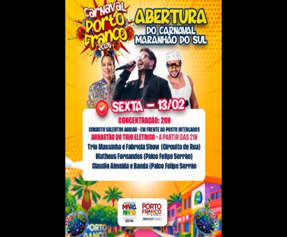 PORTO FRANCO - Terá início nesta sexta-feira (13) o tradicional Carnaval em Porto Franco, consolidando o município como palco do melhor e mais animado Carnaval do Sul do Maranhão. A programação seguirá até o dia 17 de fevereiro, reunindo tradição,…