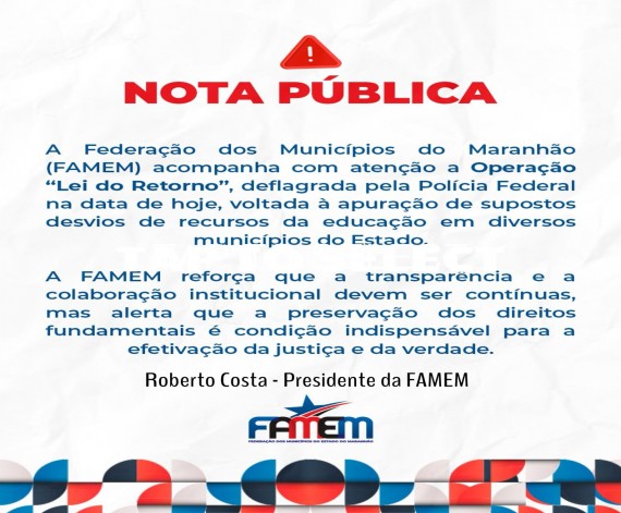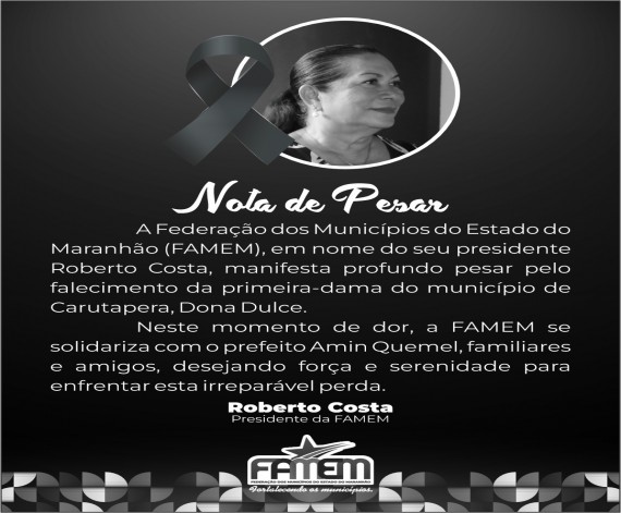 A Federação dos Municípios do Estado do Maranhão (FAMEM), por meio de seu presidente, Roberto Costa, manifesta profundo pesar pelo falecimento da primeira-dama do município de Carutapera, Dona Dulce, ocorrido nesta quarta-feira (21). Neste momento de dor, a FAMEM se…