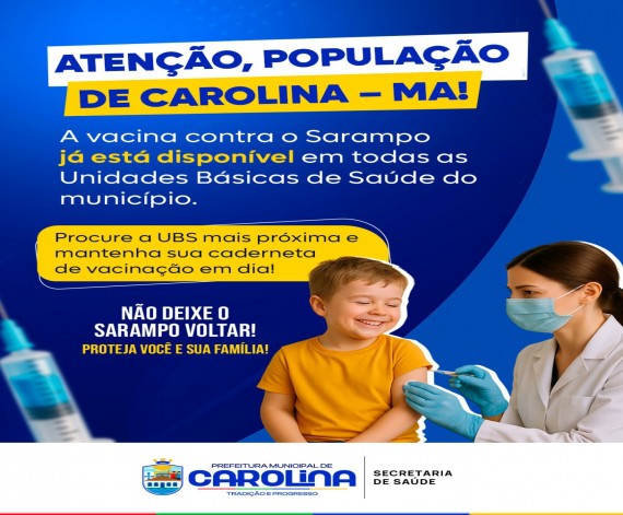 ATENÇÃO, POPULAÇÃO DE CAROLINA–MA! A vacina contra o Sarampo já está disponível em todas as Unidades Básicas de Saúde do município. Procure a UBS mais próxima e mantenha sua caderneta de vacinação em dia.…