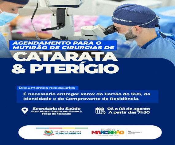 A Prefeitura de São Raimundo das Mangabeiras informa: Estão abertas as datas para agendamento do mutirão de cirurgias de Catarata e Pterígio! De 06 a 08 de agosto, a partir das 7h30, na Secretaria de Saúde, em frente à Praça do Mercado,na rua Urbano…