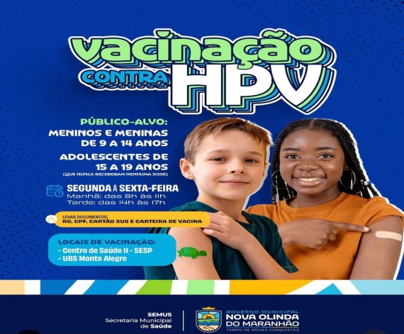 A Prefeitura de Nova Olinda do Maranhão, por meio da Secretaria Municipal de Saúde, está realizando a vacinação contra o HPV — uma medida essencial para prevenir diversos tipos de câncer causados pelo vírus. Público-alvo: * Meninos e meninas…