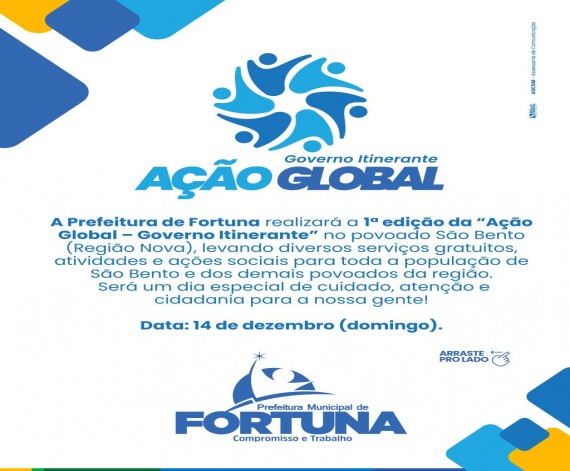O Governo Itinerante tá chegando com uma MEGA Ação Global, no povoado São Bento! A Prefeitura de Fortuna preparou um dia inteiro de serviços gratuitos: atendimentos, ações sociais, saúde, educação, assistência, esporte, cultura…