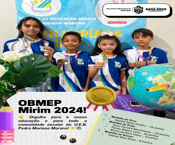 A Secretaria Municipal de Educação de Àgua Doce do Maranhão parabeniza os alunos da U.E.B. Pedro Mariano Moreno que se destacaram na OBMEP Mirim 2024! Um momento de alegria e reconhecimento pelo talento, dedicação e esforço de cada um. Medalha de Ouro…