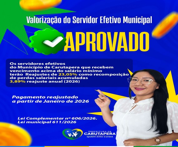 Foi aprovado o reajuste salarial dos servidores efetivos do Município de Carutapera que recebem acima do salário mínimo, garantindo: 23,05% de recomposição das perdas salariais acumuladas, 3,89% de reajuste anual referente a 2026. O pagamento reajustado passa a valer…