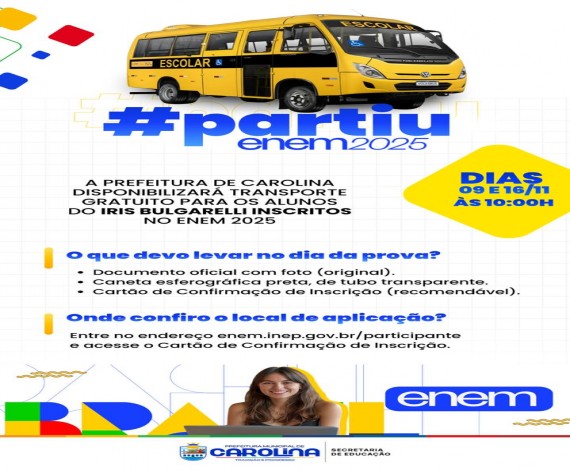 Prefeitura de Carolina disponibilizará transporte gratuito para alunos do Colégio Íris Bulgarelli inscritos no ENEM