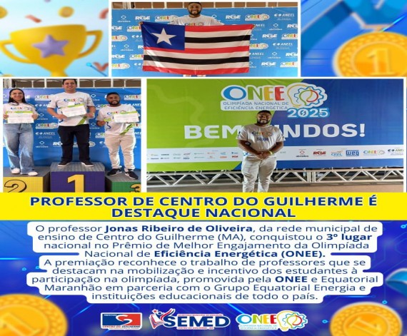 Orgulho que inspira! O professor Jonas Ribeiro de Oliveira, da rede municipal de Centro do Guilherme (MA), conquistou medalha de bronze na Olimpíada Nacional de Eficiência Energética (ONEE). Mais uma conquista que enche de orgulho o nosso município e o estado do Maranhão.…